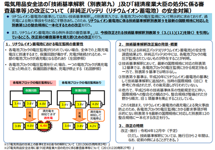 2022年11月4日,日本經濟產業省METI在官網發布了一個針對鋰電池技術標準和法規修訂的意見征集,截止時間為2022年12月3日。修訂內容:因別表9沒有明確監測電池組內每個電芯/電芯塊電壓的方法,建議廢除別表9,統一為與最新國際標準相匹配的別表12中的J62133-2。